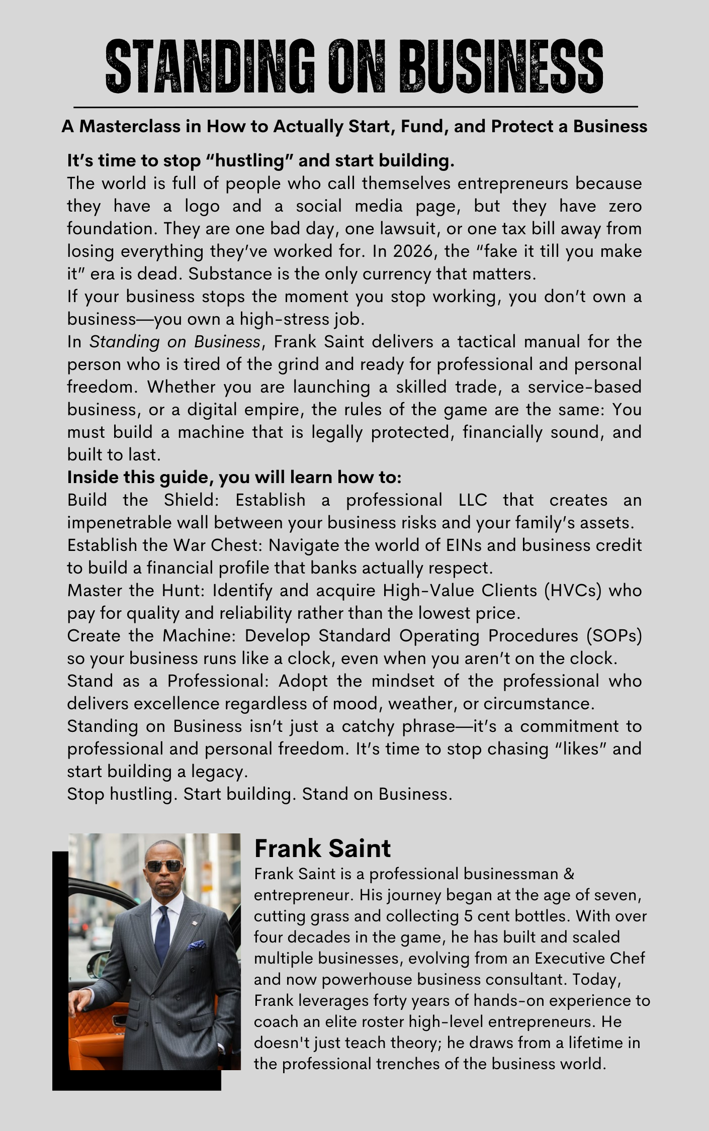 In Standing on Business, Frank Saint delivers a tactical manual for the person who is tired of the grind and ready for professional sovereignty. Whether you are launching a skilled trade, a service-based agency, or a digital empire, the rules of the game are the same: You must build a machine that is legally protected, financially sound, and built to last.